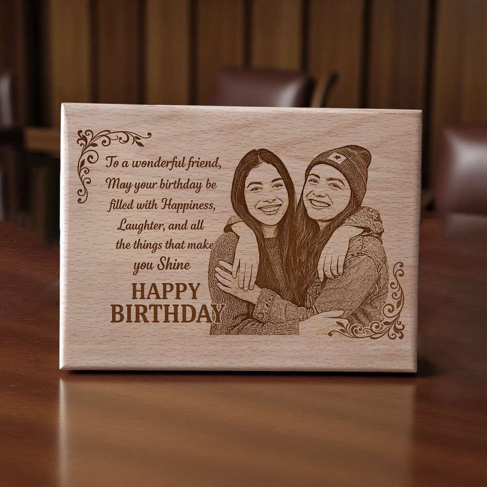 Surprise your best friend with this custom wooden photo plaque—a heartfelt birthday gift that captures love, laughter, and memories. Engraved with your favorite picture and the touching wish “To a wonderful friend, may your birthday be filled with happiness, laughter, and all the things that make you shine,” this 8×6 inch natural wood plaque is a timeless keepsake.