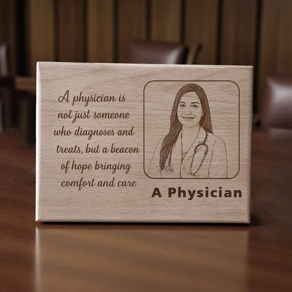 Celebrate the dedication of healthcare heroes with this custom wooden photo plaque for physicians. Engraved with a portrait and the inspiring words “A physician is not just someone who diagnoses and treats, but a beacon of hope bringing comfort and care,” this 8×6 inch natural wood plaque is a thoughtful tribute.
